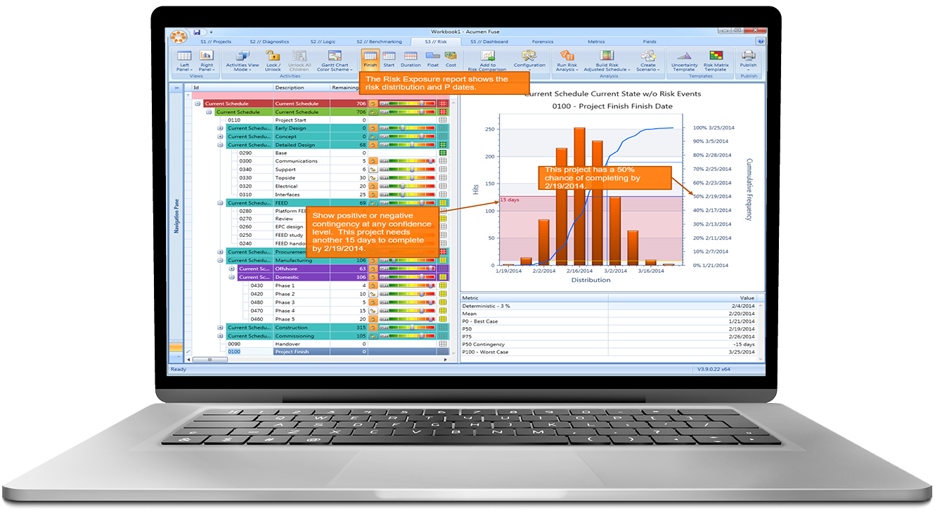 Effectively account for risk events and proactively reduce risk exposure for an accurate, reliable forecast. Straightforward analysis eliminates the statistical and logical complexities of building risk models; user-friendly charts provide insight into key risk drivers and high-risk areas of the schedule allowing for targeted mitigation efforts; a powerful Monte Carlo engine ensures the utmost accuracy and unrivaled analysis performance.