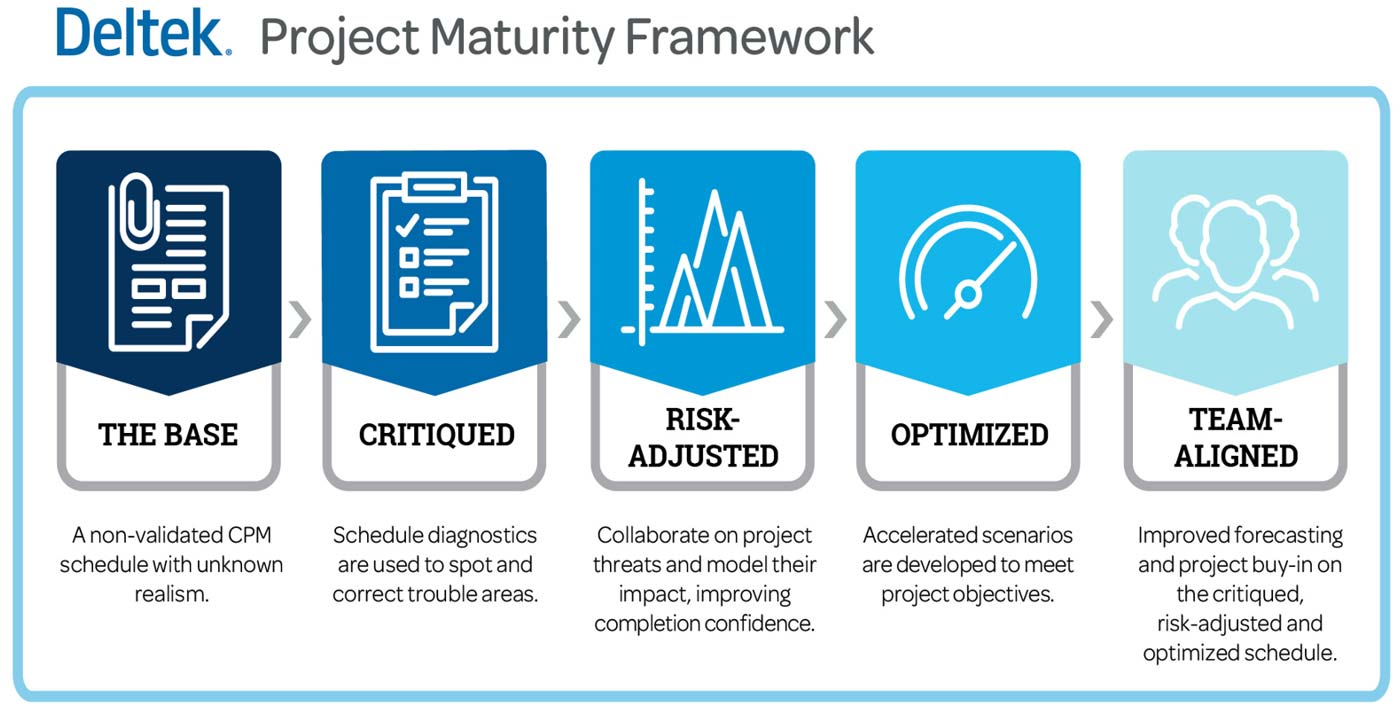 The Acumen toolset is designed to provide a structured and repeatable approach to developing sound and realistic project plans. Utilize advanced schedule analytics to improve quality and to provide a sound schedule for schedule risk analysis and optimization with Acumen 360. The Acumen approach is centered on the Deltek Project Maturity Framework. Start with a CPM baseline schedule that is evaluated and adjusted using Fuse, once the schedule quality is consistent then the schedule can be risk adjusted using Acumen Risk and is based on the risk register that has been developed by the project team. Acumen 360 can then be used to optimize the risk adjusted schedule. Touchstone goes a step further in automating your schedule submission process to ensure consistency and quality.